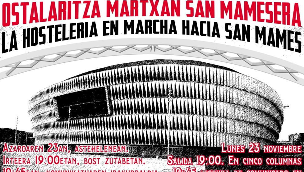 La gente relacionada con el sector quiere dejar patentes sus quejas y ha organizado una protesta para este lunes. “La hostelería en marcha hacia San Mamés”, reza el cartel elaborado por los organizadores del acto. Buscan aprovechar uno de los entornos emblemáticos de Bilbao, que además es un gran espacio abierto y sobre el que se vertebran muchos negocios.