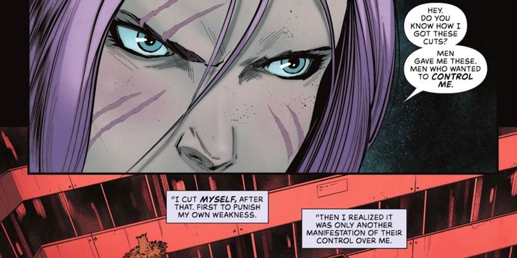 La línea tiene claras similitudes con la de Joker. Caballero oscuro línea, y le da un giro crítico que significa cómo el Universo DC puede continuar desarrollando villanos convincentes sin perpetuar más la crueldad del Joker. Como el Guasón en El caballero oscuroLas cicatrices de la cara de Ana Vulsion son parte del diseño de su personaje, pero ella es claramente diferente de él debido a su origen. Dado el abuso de Joker de Harley Quinn en el pasado al controlarla, está claro que él no es muy diferente de los hombres que intentaron “controlar” a Ana Vulsion originalmente. Ana Vulsion invierte así el significado de Joker Caballero oscuro línea, porque ella no exhibe el mismo tipo de comportamiento abusivo que él, y en cambio es una víctima que intenta vengarse.
