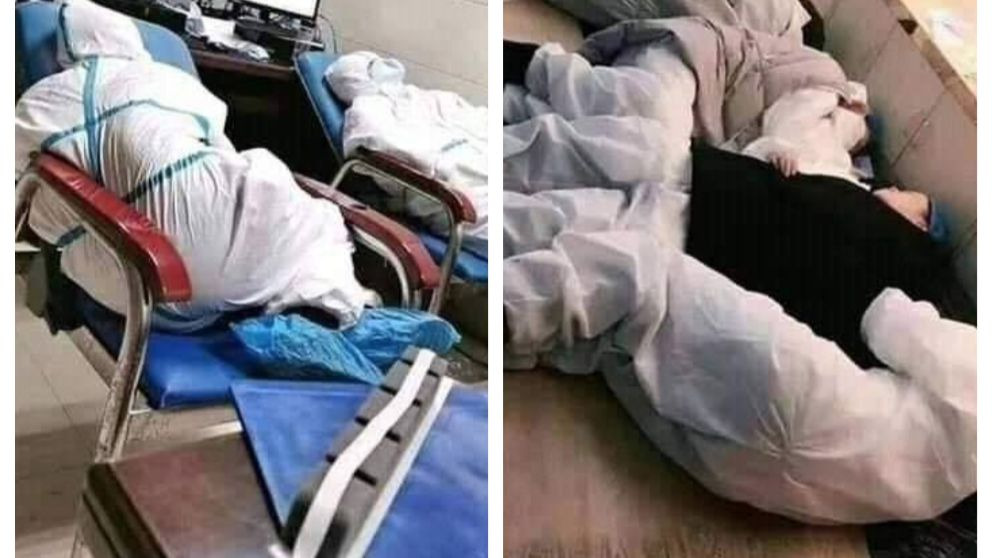 Medios internacionales han hecho públicas fotografías en las que podemos observar a sanitarios chinos que están atendiendo a los pacientes afectados por la enfermedad en diferentes puntos del país asiático. Las imágenes muestran a médicos con batas y mascarillas descansando donde pueden: en las sillas de trabajo, en las butacas o incluso en el suelo.