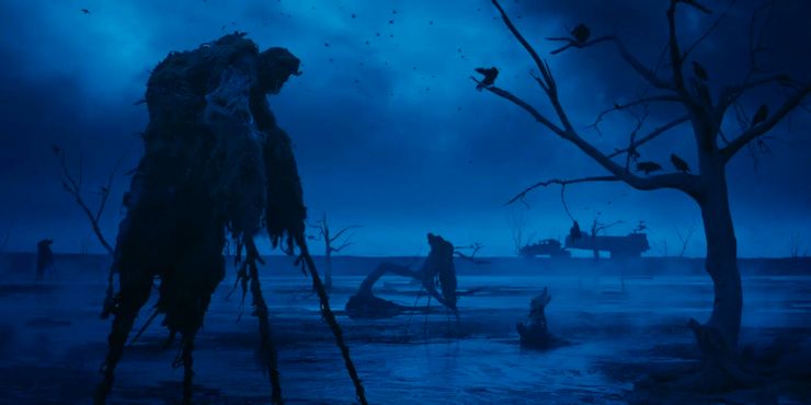 Aunque Guerra de las Galaxias es la principal influencia de Snyder en Luna rebeldela película había sido originalmente una Guerra de las Galaxias lanzamiento de Zack Snyder, algunas influencias de George Miller Mad Max: Furia en la carretera también podría haber encontrado su camino en la película. El entorno desértico que se ve en las fotos del set podría dar fe de una Camino de furia homenaje tanto como el de Tatooine en Star Wars: Episodio IV – Una nueva esperanza. Esto también podría extenderse al diseño de Jimmy como una posible versión cibernética de Camino de furiaLos pescadores de cuervos. El diseño de la corona de asta y la prenda similar a una bufanda que usa Jimmy recuerdan a los Crow Fishers. Los Crow Fishers se ven en la película durante la sección en la que Max (Tom Hardy), Furiosa (Charlize Theron) y sus pasajeros conducen a través de un pantano, con los Crow Fishers mirando. Más tarde, el grupo se entera de que este pantano era en realidad los restos podridos del oasis conocido como Green Place, que había sido su destino.