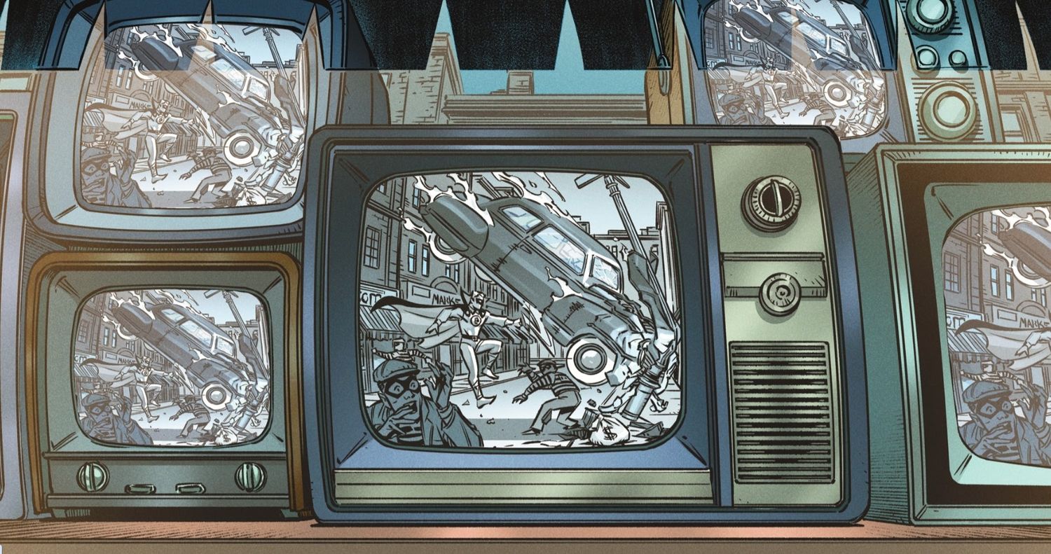 Jeremy Adams y Diego Olortegui Jay Garrick: El flash El número 4 lleva a los lectores a través de los recuerdos del Profesor Hughes (que en realidad es el malvado Doctor Elemental), retrocediendo hasta 1938. Se revela que, en su camino para celebrar su puesto recién obtenido, Hughes vio una hazaña asombrosa que lo haría volar en espiral. en la obsesión y la villanía: una de las primeras retransmisiones de Alan Scott, el primer Linterna Verde, frustrando un robo.