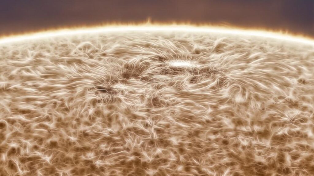 «Esta foto fue tomada con mi telescopio solar en el patio», reza el post (que puedes ver pinchando aquí ). La imagen muestra la «naturaleza turbulenta de la cromosfera solar «; la segunda de las tres capas principales de la atmósfera solar que tiene unos 2000 kilómetros de espesor con una temperatura media de casi 10.000 ° C.