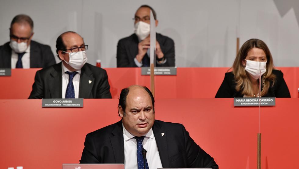 La asamblea se prolongó por espacio de seis horas y 20 minutos. Y eso que el discurso presidencial resultó esta vez mucho más corto de la habitual. Elizegi, atento a la pantalla, fue intercalando euskera y castellano en sus intervenciones. Los asesores del presidente no le dejaron en esta ocasión margen para la improvisación.