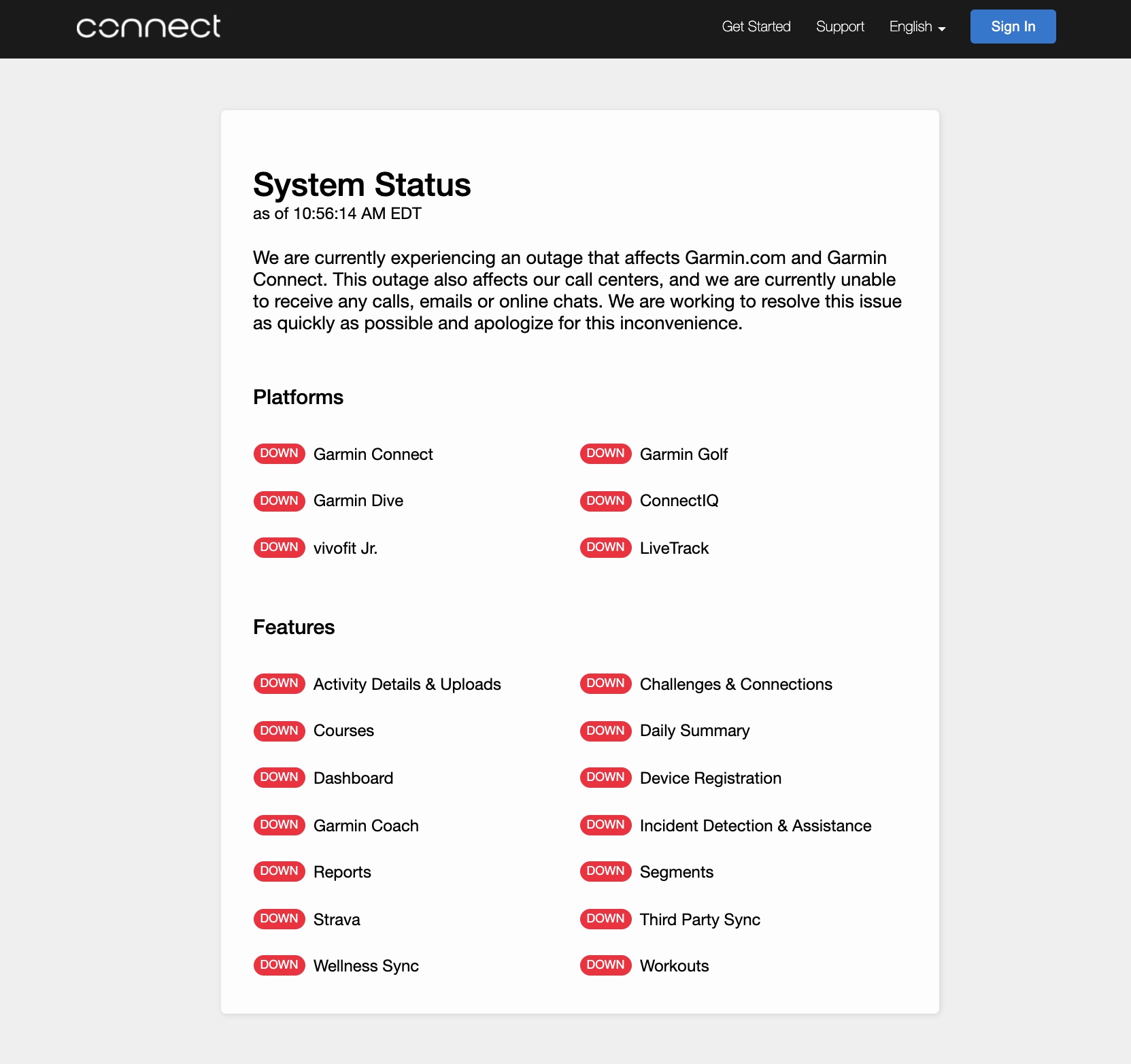 Algunas partes del sitio web de Garmin también estaban fuera de línea en el momento de la escritura.