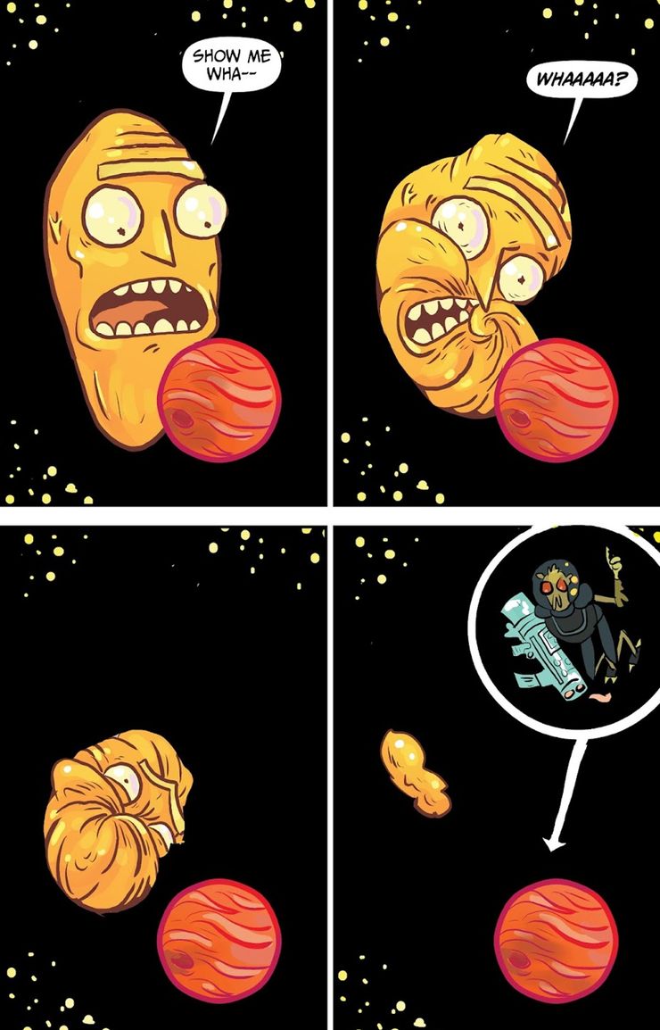 ‘La vida y muerte de Krombopulos Michael’ de Rick y Morty #34, escrito y dibujado por Kyle Starks, explora la vida del asesino antes de ser aplastado por la nave espacial de Rick y Morty en su fatídica última misión. La historia ofrece explicaciones sobre el nombre de Krombopulos Michael, su relación comercial con Rick y la identidad de la mujer representada en el relicario que mira después de orar. Sin embargo, también lo muestra en misiones, una de las cuales es destruir un Cromulon que está gritando “¡Muéstrame lo que tienes!” a lo último música del planeta planeta concursante. Esto muestra que Krombopulos Michael está listo, dispuesto y es capaz de destruir a la raza invulnerable, y podría haber salvado la Tierra si no hubiera perecido unos pocos episodios antes de su llegada.