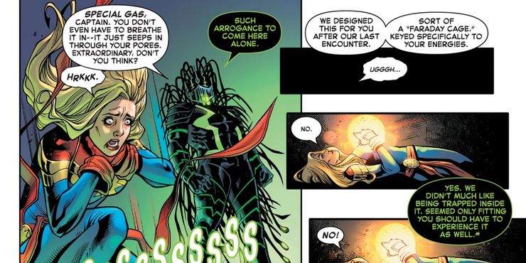 Mientras se encuentra en su laboratorio, Vox Supreme libera una toxina peligrosa que rápidamente incapacita a la Capitana Marvel antes de que tenga la oportunidad de combatir sus efectos. Si bien Vox Supreme tomó a Carol por sorpresa con esta toxina, a la que solo se hace referencia como ‘Gas especial’ en este número, la verdad es que no importó si vio venir el ataque debido a las propiedades de este ‘Gas especial’. ‘ En lugar de requerir que uno respire el veneno para que tenga un impacto, el gas especial se absorbe a través de la piel del Capitán Marvel, lo cual es más efectivo dado el hecho de que el Capitán Marvel no necesita respirar, así que simplemente estar en la misma habitación. con el gas es suficiente para noquearla en segundos. Esta debilidad es similar a la deficiencia de Superman cuando se expone a la kryptonita, pero en realidad es mucho más peligrosa en el caso del Capitán Marvel. Cuando Superman está cerca de Kryptonita, se debilita pero aún es lo suficientemente fuerte como para tratar de escapar de la sustancia mortal. El Capitán Marvel, sin embargo, fue derribado tan completamente por el Gas especial que no había posibilidad de que pudiera escapar.