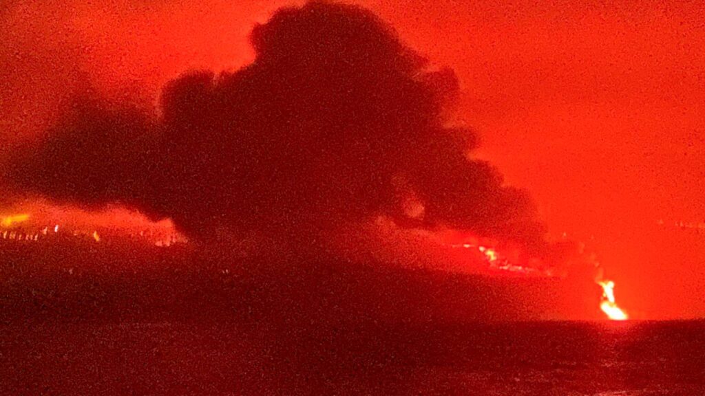 Imagen de la Salvamar Alphard en la zona de exclusión en #LaPalma. La lava se precipita al mar en la zona de la playa de Los Guirres desde 23h canarias. En la zona hay viento del Sur. pic.twitter.com/OdCZnRsJWj