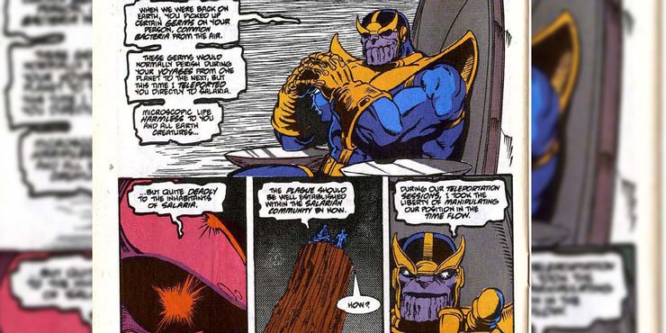 Thanos se ríe cuando Silver Surfer se apresura a regresar a Salaria para usar el Power Cosmic para crear un anti-cuerpo que detiene la plaga que asola el planeta. Silver Surfer ya siente una gran culpa por verse obligado a llevar a Galactus a devorar mundos, por lo que Thanos lo golpeó donde le duele, haciéndolo sentir responsable una vez más de la muerte a gran escala.