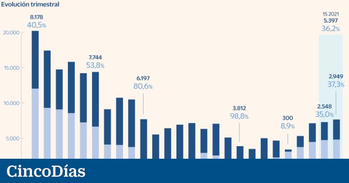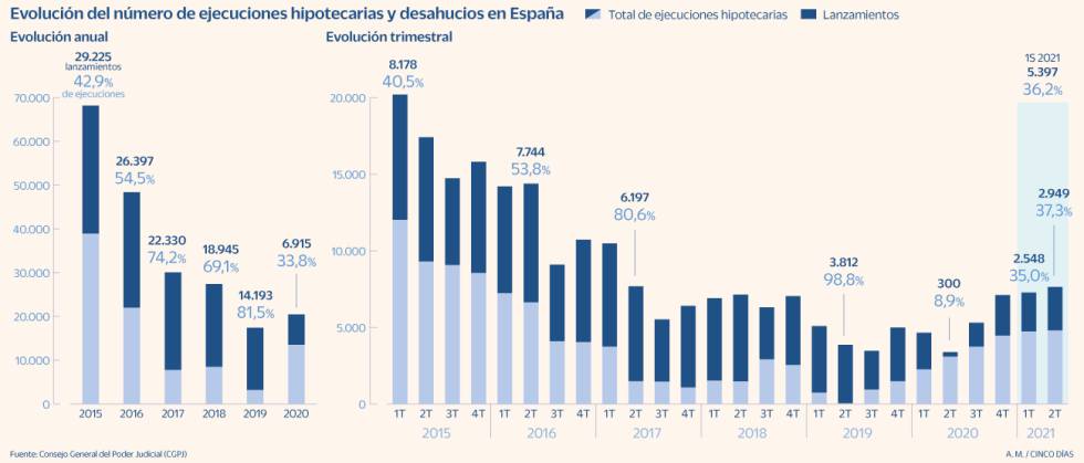 Las cifras del CGPJ muestran, por un lado, que en los últimos tres trimestres (desde octubre de 2020 a junio de 2021) el porcentaje de lanzamientos ha caído en más de la mitad, moviéndose entre el 35% y el 37%. Por otro, alertan del aumento de ejecuciones hipotecarias, el paso previo al desahucio. Si en los trimestres previos a la pandemia España se movía entre las 3.000 y las 5.000 ejecuciones, desde octubre de 2020 hasta junio de 2021 los periodos cierran con más de 7.000 procesos abiertos.