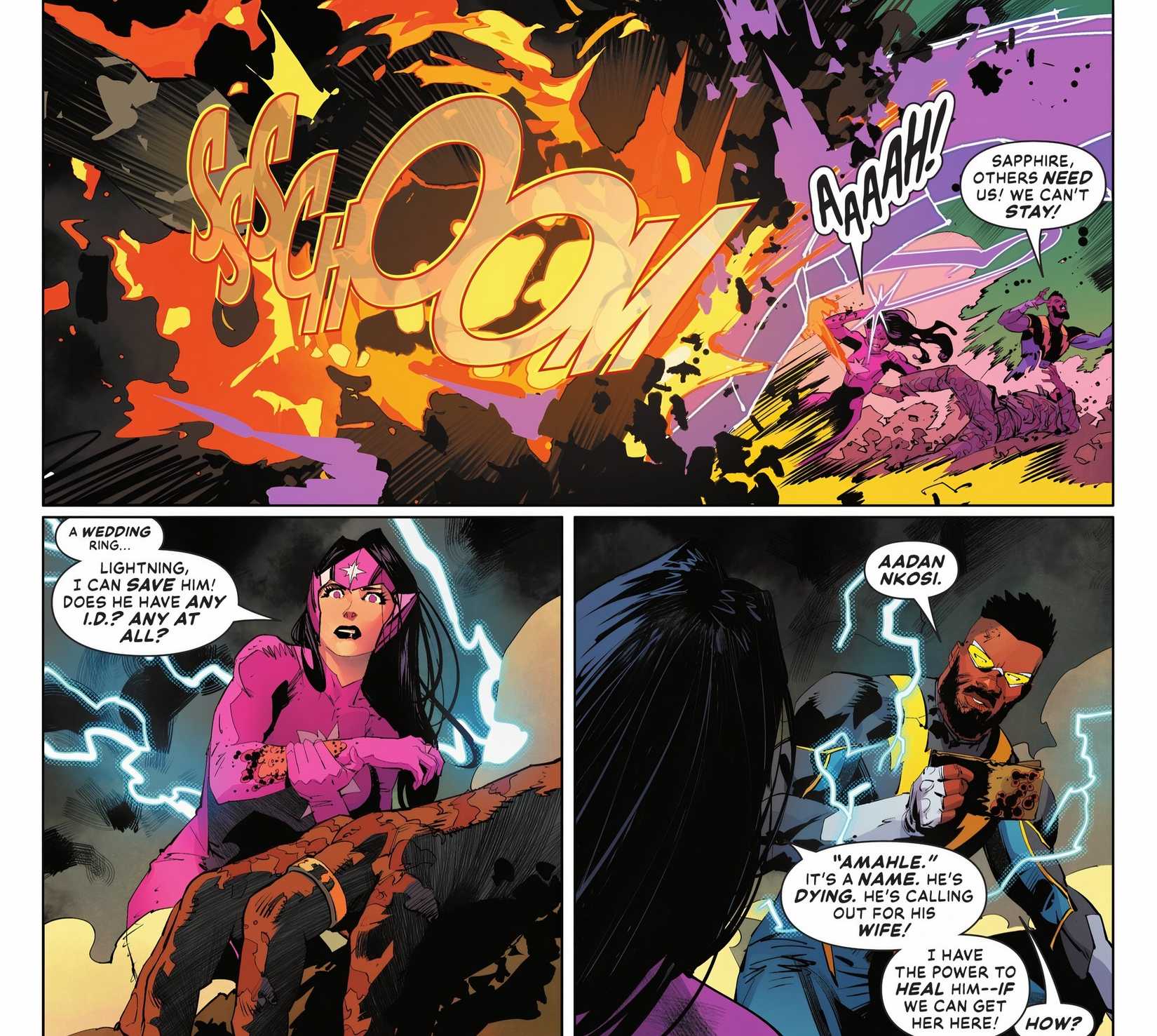 Por eso Star Sapphire resulta tan refrescante. Ella todavía está encontrando su equilibrio, insegura de sí misma y carente de la confianza habitual de un héroe experimentado, lo que aporta una nueva perspectiva y crea espacio para un crecimiento increíble del personaje. Además de eso, su conjunto de poderes es completamente único. A diferencia de sus compañeros centrados en el combate, ella ejerce el poder literal del amor.—una distinción que se muestra maravillosamente en este número cuando utiliza el amor de una esposa para sanar a su marido fatalmente herido. Es esta combinación de vulnerabilidad y singularidad lo que hace que Star Sapphire sea una incorporación tan destacada al equipo.