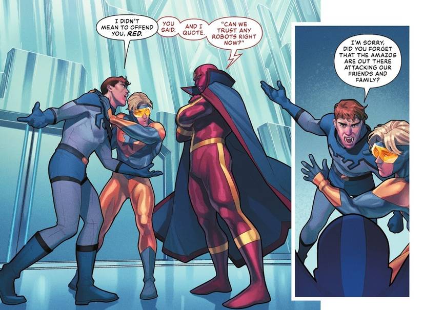 - La Liga de la Justicia se enfrenta a enemigos androides que les robaron sus poderes, lo que genera tensiones y acusaciones hacia Tornado Rojo.