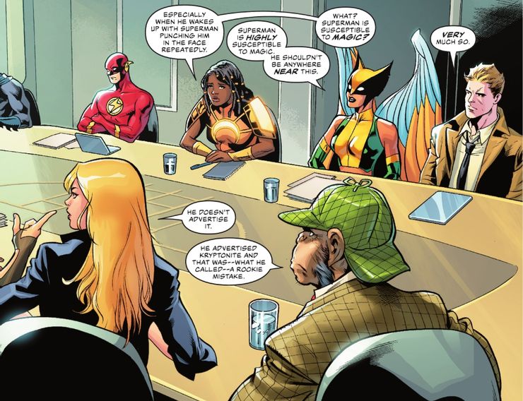 En Liga de la Justicia #73, el miembro más nuevo de la Liga, Naomi McDuffie (AKA Powerhouse), se sienta a la mesa con el resto del equipo. Conoció a Superman por primera vez en Bendis y Kudranski’s. Cómics de acción #1015 cuando se estrelló frente al edificio del Daily Planet. Luego, Clark llevó a la joven heroína al Salón de la Justicia, donde Batman y Atom analizaron sus orígenes multidimensionales. Después de algunos años de familiarizarse con la Liga, Naomi finalmente preguntó a sus compañeros de equipo sobre la situación de Superman con la magia.