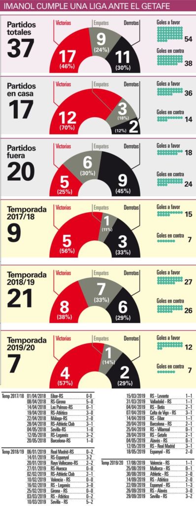 Tomando como referencia la última campaña, con los 60 puntos que ha logrado la Real en 37 encuentros con Imanol, la escuadra txuri urdin habría sido quinta. Y con 63, puntaje que abrazará si vence este domingo ante el Getafe, el pasado curso habría quedado cuarta. Según el promedio de los últimos 10 años en Primera, con 60 puntos lo normal es ser sextos y con 63 es más natural o ser quintos (tres veces en 10 años con 60 o menos puntos) o cuartos (otras tres veces).