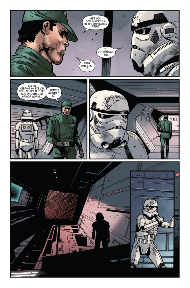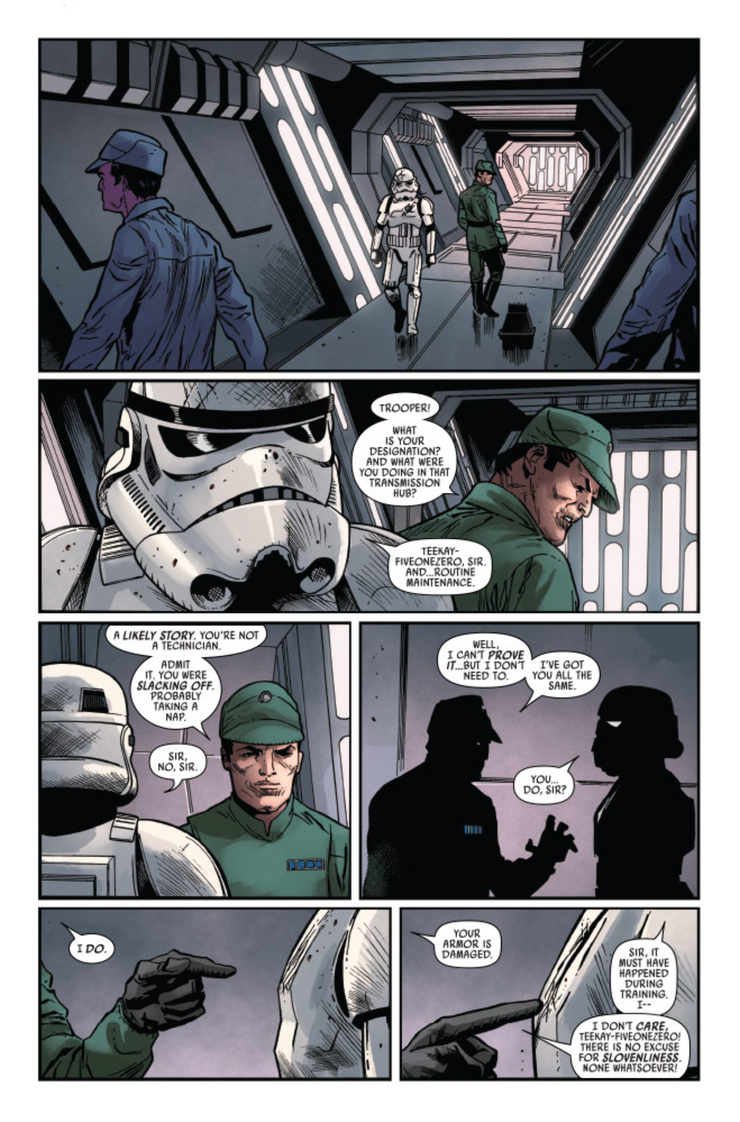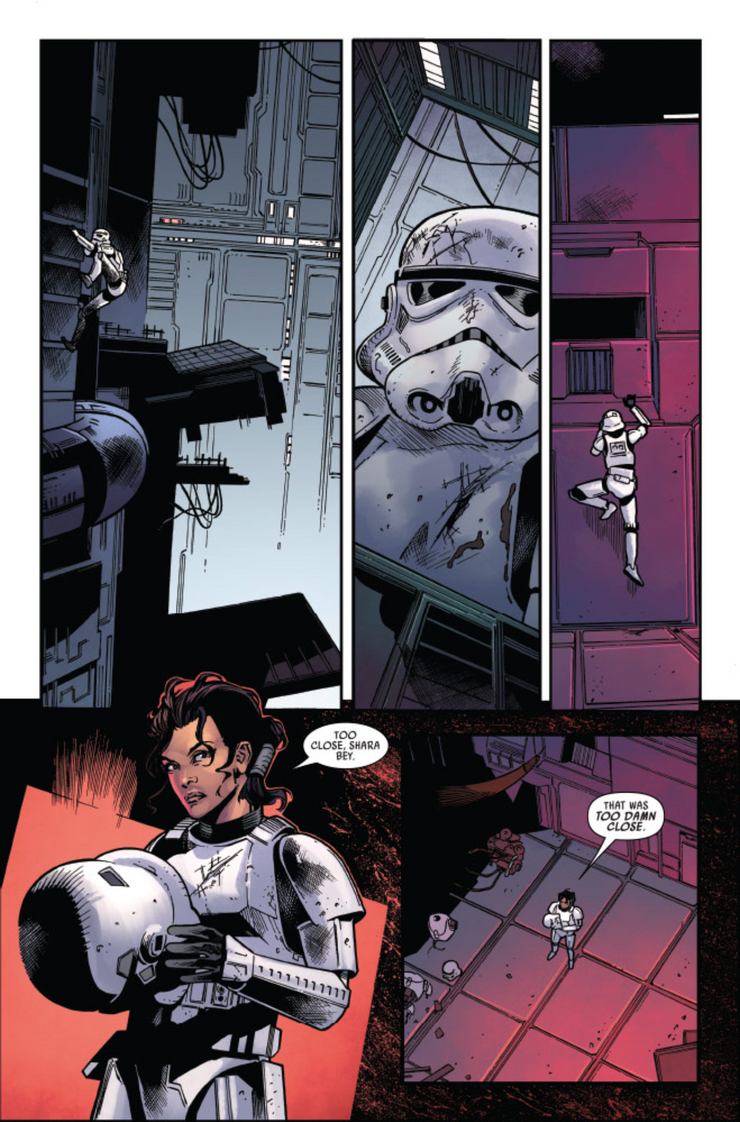 En contraste, la madre de Poe Dameron es capaz de pensar rápidamente usando su propio disfraz de soldado de asalto, logrando evadir la detección a pesar de ser detenida en una confrontación cara a cara. Revelado en la nueva vista previa de Guerra de las Galaxias #21 publicado por StarWars.com, Shara está en desventaja con su armadura luciendo bastante deteriorada. No sólo eso, sino que también ha estado viviendo en el Destructor Estelar conocido como el Voluntad de Tarkin durante bastante tiempo, haciendo todo lo posible para sobrevivir hasta que sus compañeros rebeldes puedan rescatarla. Aquí están las páginas de vista previa y la sinopsis del próximo número de Charles Soule y Marco Castiello: