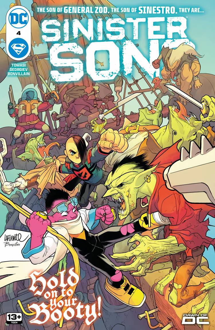 Hijos siniestros #4 – escrito por Peter J. Tomas, con arte de Vasco Georgiev – continúa las aventuras de Lor-Zod y Sinson, los hijos del general Zod y Sinestro. Se encuentran dentro del vientre de una ballena espacial, donde se encuentran con un heroico astronauta llamado Mayor Tom. Cuando se enfrentan a piratas alienígenas de capa y espada, el Mayor Tom parafrasea a Rorschach de Vigilantes.