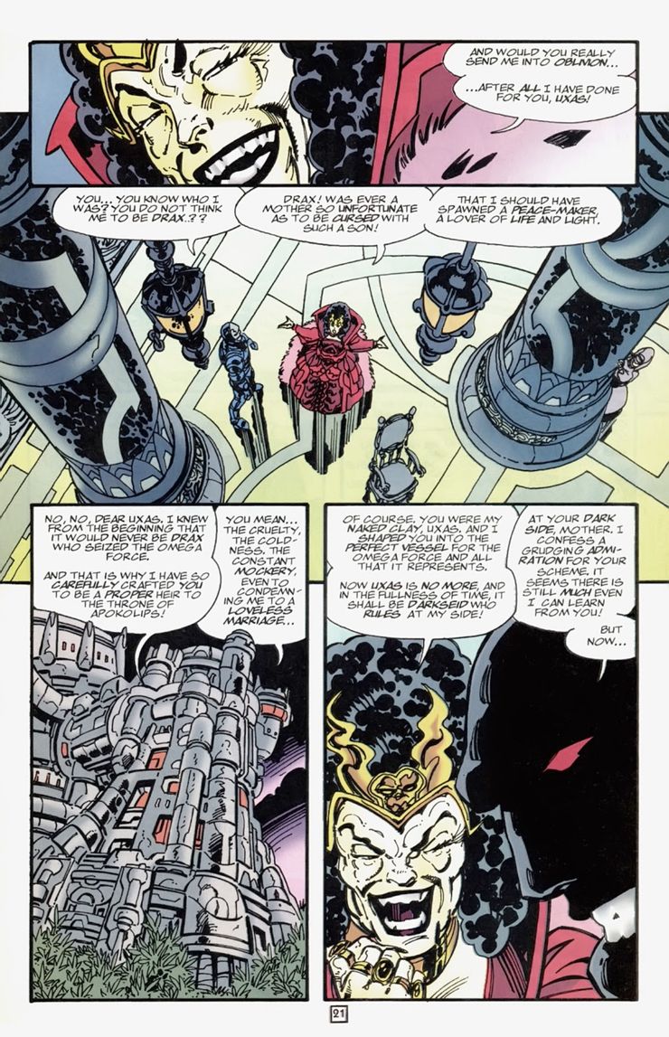 En el número cinco, Darkseid regresa, pero no le dice a su madre su verdadera identidad; trata de convencerla de que es Drax, pero ella ve a través de su engaño. Heggra revela que ha orquestado cuidadosamente los asuntos para que Darkseid matara a su hermano y reclamara la Fuerza Omega; continúa y detalla cómo estaba disgustada con Drax, a quien condescendientemente llamó un “pacificador” y un “amante de la vida y la luz”. Quería que Darkseid tomara la Fuerza Omega, porque sería un verdadero gobernante de Apokolips.
