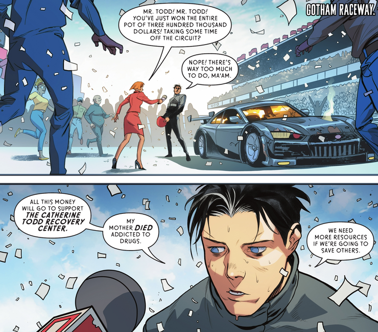 En Batman: Leyendas urbanas #1, Jason terminó matando a un hombre que causó una sobredosis a una mujer y le recordó su propia infancia abusiva, en la que empujó al traficante de drogas de su madre por las escaleras. Asimismo, en las páginas de Petirrojos #5, Jason vio la vida que Batman creía que habría vivido si no se hubiera convertido en Robin. En este mundo teórico, Jason es un piloto de carreras que usa sus ganancias para financiar la rehabilitación de drogas en nombre de su madre. La parte interesante de estas historias es que ya no tratan el tiempo de Jason como Robin como su verdadero origen. A medida que las apariciones de Jason se alejan simultáneamente de culpar a Batman por su muerte, DC Comics se está alejando de los orígenes traumáticos de superhéroe de Jason y, en cambio, se centra en sus propios orígenes personales con su madre, separados de su tiempo como el chico malo Robin y el trágico compañero de Batman.