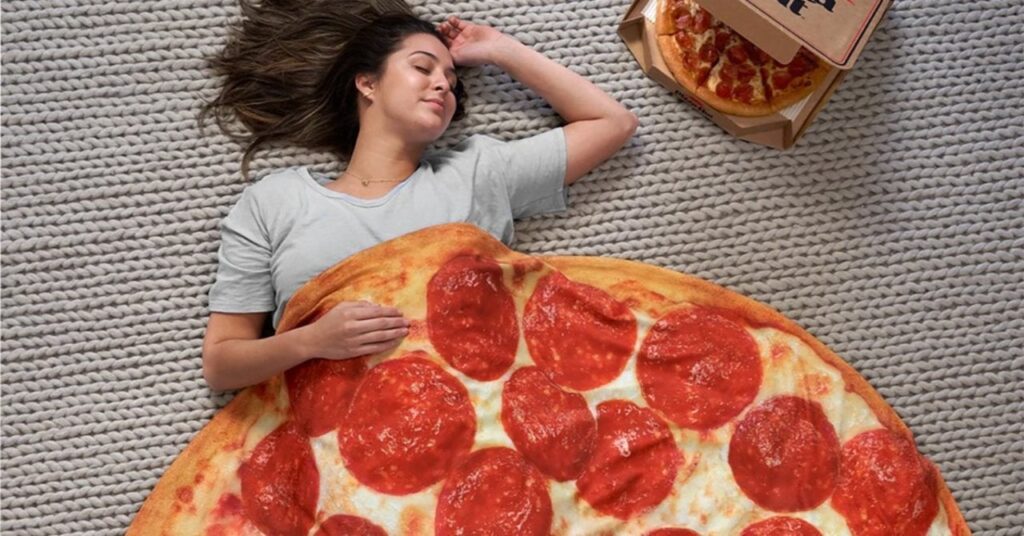 Al igual que la pizza real, esta manta también resultará rápidamente en un peso adicional de 15 libras, pero ese peso adicional ayudará a mejorar la calidad de su sueño y reducirá el estrés y la ansiedad gracias al “poder de la estimulación de presión profunda” (o, en este caso, “estimulación de presión de pizza de plato hondo”). Además, se puede quitar fácilmente sin ejercicio. De hecho, nunca tienes que levantarte del sofá.
