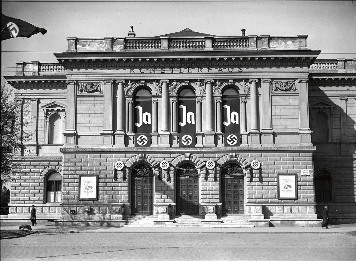 La Cámara, dirigida por una élite de artistas que ya eran nazis cuando ser nazi era ilegal en Austria, se instaló en Viena en la Künstlerhaus (sede actual del Albertina Modern, especializado en arte contemporáneo, uno de los grandes difusores de las vanguardias posdegeneradas). El edificio historicista lucía en marzo de 1938 una sucesión de estandartes con cruces gamadas y un Ja Ja Ja en la arquería. Parece la onomatopeya de la risa nazi durante el Anschluss, pero ja significa ‘sí’ en alemán. Se había convocado un referéndum para bendecir la ocupación nazi y la institución instaba a votar a favor.