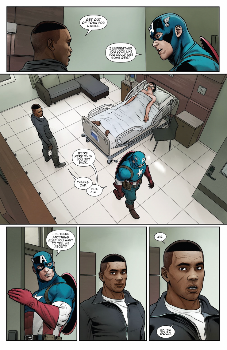 En hombre de hierro #22, escrito por Christopher Cantwell con arte de Angel Unzueta, una pelea entre Iron Man y Titanium Man deja a Tony postrado en cama, pero recuperándose, después de una dosis casi fatal del Compuesto 13. El Capitán América visita a Tony Stark en el hospital y le ofrece a War Machine una lugar en los Vengadores para ocupar el papel de Iron Man hasta que se recupere. Cuando Rhodes se niega, las sospechas del Capitán América surgen de inmediato. “Jim… ¿hay algo más que quieras contarme?” Rhodes simplemente responde “No. No, estoy bien” y el Capitán América sale de la habitación del hospital sin decir una palabra más.