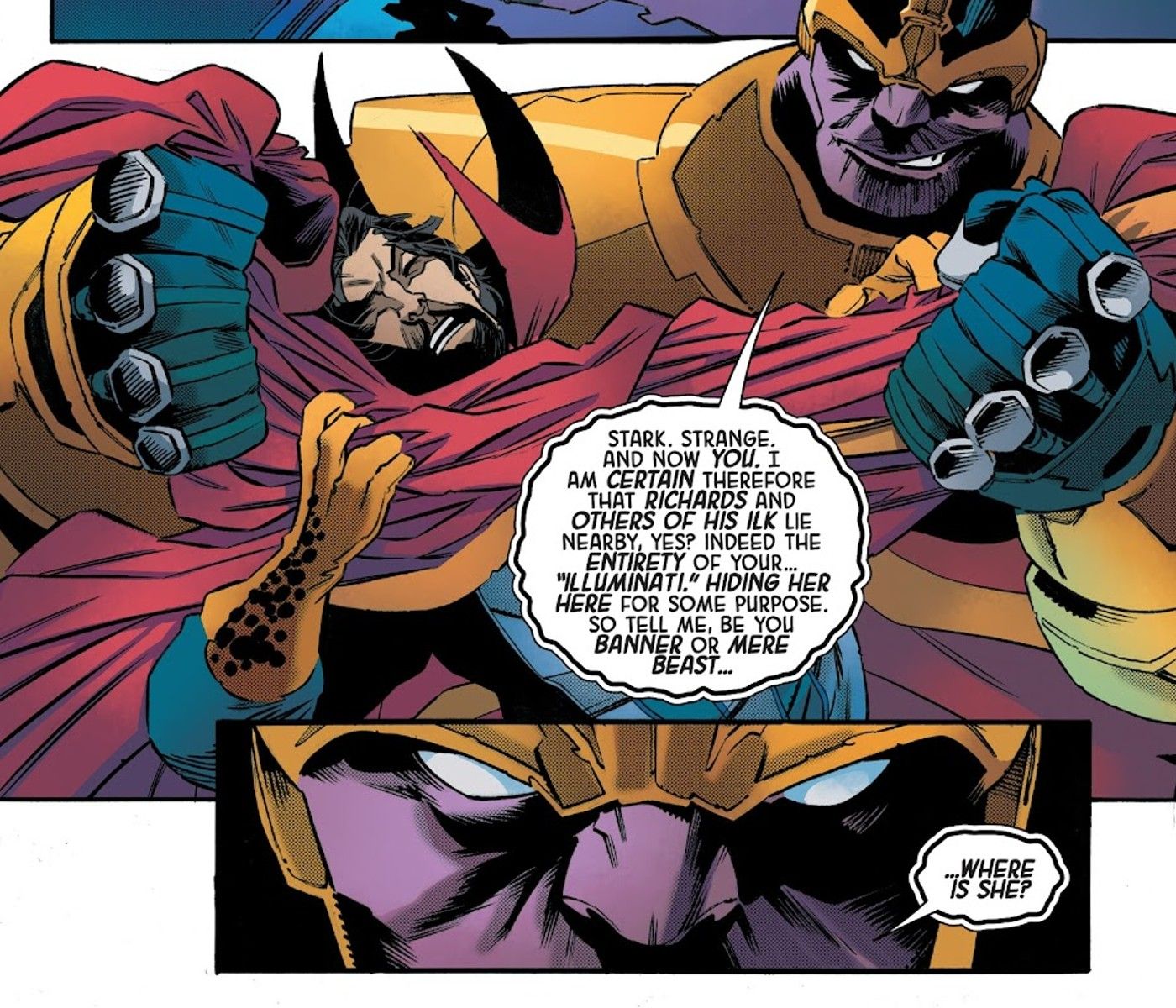 “/> En este momento, Strange es miembro de un Illuminati renovado que incluye a Blue Marvel, Reed Richards, Iron Man y Emma Frost. Los nuevos Illuminati han disfrazado a Mistress Death como una mujer llamada Roberta, una cajera convencida de que está viviendo una vida normal en la Tierra. Los héroes trabajan para evitar que Thanos alcance a Mistress Death, pero uno por uno, todos los miembros de los Illuminati (y Hulk, que solo quiere otra revancha con Thanos) caen ante el Titán Loco. Muy pronto después del altercado, es el turno del Doctor Strange de combatir a Thanos.