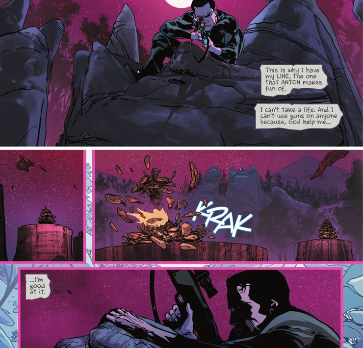 Ahora, el nuevo Batman: El Caballero #6 ve a Bruce y Minhkhoa reuniéndose con Luka Jungo, “The Swiss Mark”. A pesar de su retiro y de buscar una vida en paz, el mejor tirador del mundo accede a enseñar a los dos jóvenes a disparar con el expreso propósito de usar dichas habilidades para evadir enemigos armados y desarmar a sus oponentes. Sin embargo, el nuevo número revela que Bruce es un tirador increíblemente dotado con un inmenso talento natural, un concepto irónico considerando su odio por las armas después del asesinato de los padres de Batman, Thomas y Martha Wayne.