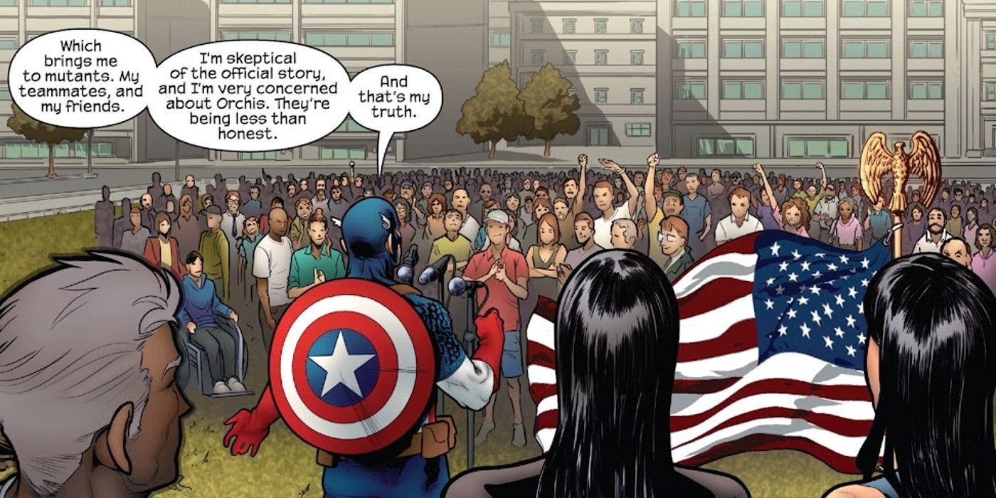 Las cualidades más fácilmente reconocibles del Capitán América son físicas: su escudo, su superfuerza, el esquema de colores de su bandera estadounidense, pero sus mejores cualidades están dentro de sí mismo. En esencia, Steve Rogers es un orador, ya que sus palabras tienen el potencial de derribar imperios, de la misma manera que sus puños han derribado gigantes. Mientras los X-Men y los mutantes en su conjunto, incluidos aquellos dentro de Los Uncanny Avengers de Cap, buscan arreglar las relaciones de los mutantes con los humanos, devolver al mundo a un rumbo más esperanzador y mostrarle al mundo los verdaderos colores de Orchis, los inspiradores discursos del Capitán América lo harán. demostrar ser un factor X importante de su lado.