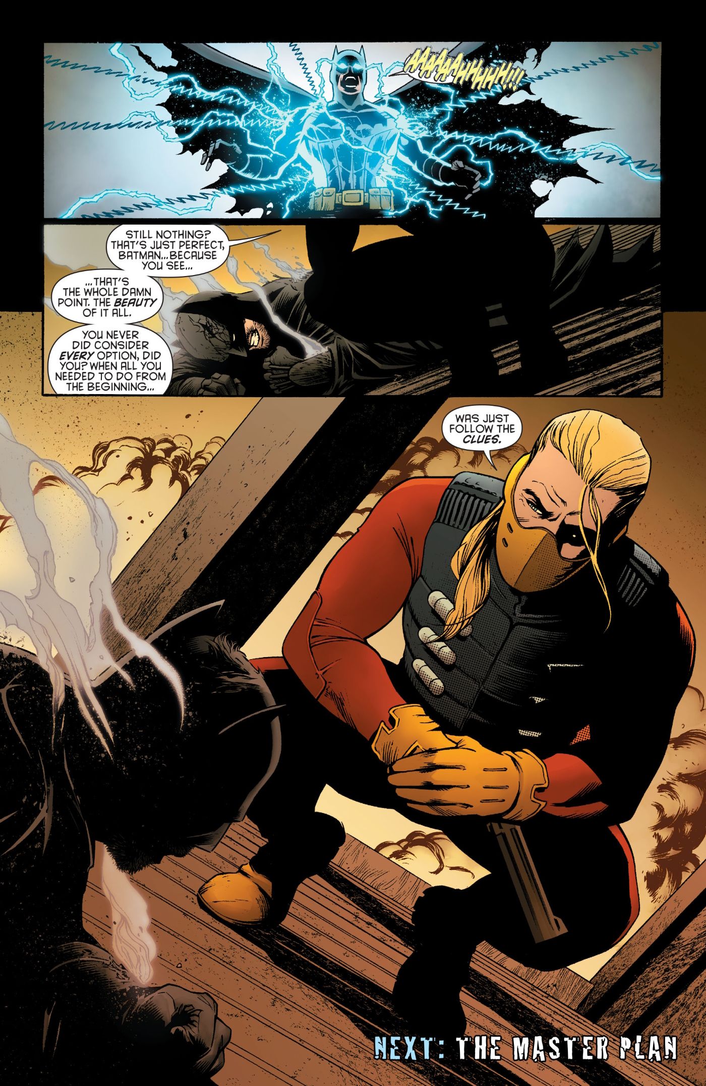 Robin no tiene toda la culpa por suponer que algo está pasando es más grande de lo que realmente es. Batman hace lo mismo, y casi lo mata, en 2015 batman: eterno #50 por Scott Snyder, James Tynion IV, Ray Fawkes, Kyle Higgins, Tim Seeley, Álvaro Martínez, Rauel Fernández y June Chung. A lo largo de los acontecimientos de batman: eterno, Batman está luchando contra un complot que parece estar destruyendo su vida y poniendo en peligro a sus aliados, como que James Gordon sea incriminado y enviado a prisión. Naturalmente, Batman asume continuamente que las personas detrás de esta trama deben ser villanos de alto nivel. Pasa de pensar que es Riddler, a Joker, y finalmente acusa a Ra’s al Ghul de ser el gran maestro de esta ola de crímenes. Pero resulta que no es ninguno de estos villanos. El verdadero villano detrás de esto es Cluemaster, alguien tan pequeño que Batman ni siquiera lo considera una posibilidad. De hecho, Batman ni siquiera reconoce la voz de Cluemaster cuando se revela.