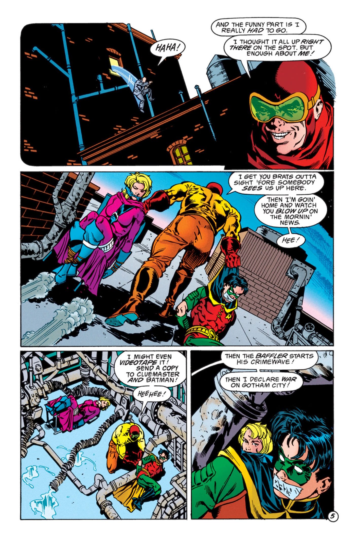 en 1997 Robin # 44 por Chuck Dixon, Staz Johnson y Bob Smith, Robin y Spoiler son atraídos a una trampa por un villano conocido como Baffler. The Baffler era un completo imbécil, alguien que anhelaba copiar los crímenes de Cluemaster y Riddler, pero que carecía de su inteligencia o capacidad de planificación. A pesar de esto, Baffler logró capturar tanto a Stephanie como a Robin debido al hecho de que Robin pasó por alto a alguien como Baffler como una amenaza real. Robin incluso encuentra una de las pistas de Baffler, pero asume que los errores ortográficos podrían ser solo parte de la pista, en lugar de accidentales. Este es un gran descuido por parte de Robin porque Robin se encontró previamente con el Baffler. Si reconociera la incapacidad del hombre para deletrear, en lugar de simplemente asumir que es parte del truco, Robin casi no sería asesinado por uno de los peores criminales de Ciudad Gótica.