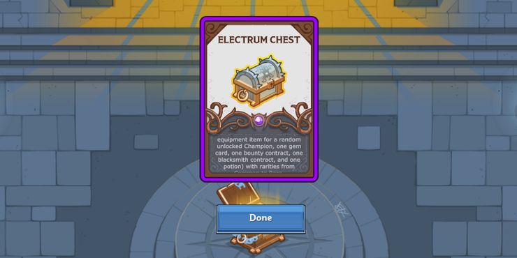 El último tipo de cofre más utilizado por los jugadores son los cofres electrum, y estos solo están disponibles mediante el uso de los códigos proporcionados durante la presentación. Campeones inactivos Transmisiones de contracción. Los cofres de electrum contienen cinco cartas, al igual que los cofres de oro, pero su contenido difiere ligeramente. De los cofres de electrum, los jugadores recibirán una tarjeta de equipo, un contrato de recompensa, un contrato de herrero (para construir un D&D equipo del personaje), un beneficio aleatorio y un número aleatorio de gemas, la moneda del juego.