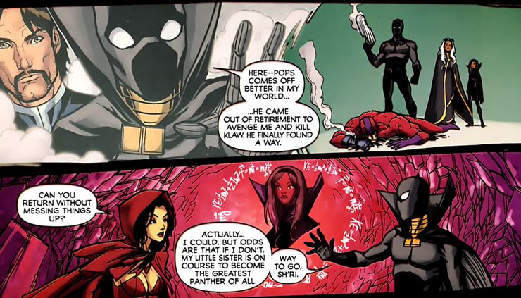 Desafortunadamente, su matrimonio no dura. T’Challa y Ororo anulan su matrimonio en Jason Aaron y Adam Kubert’s Vengadores vs.X-Men # 9. Sh’ri habría sido un recordatorio vivo de una paz temporal en la Tierra-616. Quizás es por eso que T’Chaka considera que su hermana es tan digna de mención. Si Sh’ri se convierte en la Reina de Wakanda y tiene poderes mutantes, T’Challa y Tormentala hija no solo va a ser la mejor Pantera negra; ella puede traer la paz en todo el mundo de Comics Marvel. Si Storm y T’Challa se vuelven a juntar de forma permanente, no hay ninguna duda de que enseñarían bien a sus hijos.