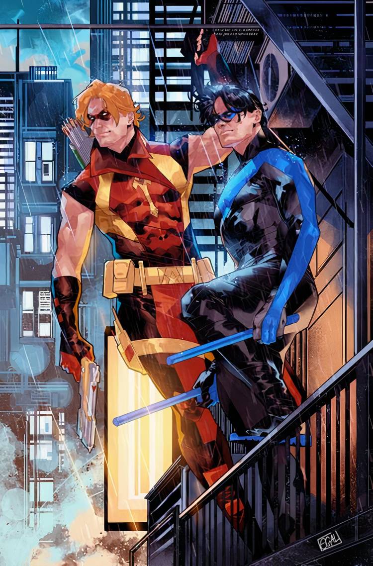 Variante de Galmon para Titanes El número 17 muestra a Roy y Dick con sus disfraces de Arsenal y Nightwing, uno al lado del otro. en una escalera de incendios mientras observan la ciudad. Ambos héroes tienen sus armas desenfundadas, Roy sostiene su pistola a un lado y Dick sostiene de manera similar sus bastones de esgrima. Este momento en el que el dúo vuelve a estar de pie juntos como adultos es un hermoso momento de círculo completo que conlleva una fuerte sensación de nostalgia, que refleja su larga y legendaria historia que comenzó con su tiempo en la lista original del equipo de los Jóvenes Titanes como Robin y Speedy.