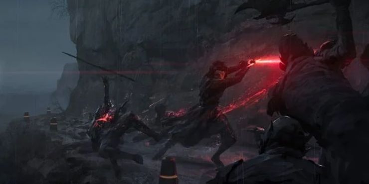 Nuevo arte de Guerra de las Galaxias El artista conceptual Jon McCoy ha revelado que la misión Ren de Kylo se concibió inicialmente para ser un asunto más largo y mucho más brutal. Hay un puñado de imágenes que muestran a Ren en un largo camino luchando contra legiones de guerreros por su cuenta antes de encontrar el Wayfinder. Tiempo El ascenso de Skywalker es una película larga, este nuevo arte demuestra que un viaje más largo y desafiante habría valido la pena, estableciendo el tono bastante bien para el personaje de Kylo mientras se enfoca en su determinación despiadada de asegurar su gobierno.