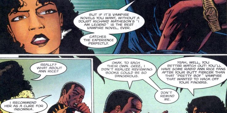 Dominque Levant ha venido a Blade, pidiéndole ayuda para despachar a un vampiro. Dominque intenta conocer a Blade y le pide su opinión sobre novelas populares de vampiros. Blade confiesa que prefiere las novelas policiales de procedimiento, pero si Dominque quiere una buena novela de vampiros, no busque más allá de la de Richard Matheson. Soy leyenda. Blade se refiere a ella como la mejor novela de vampiros escrita, y “capta la experiencia a la perfección”.