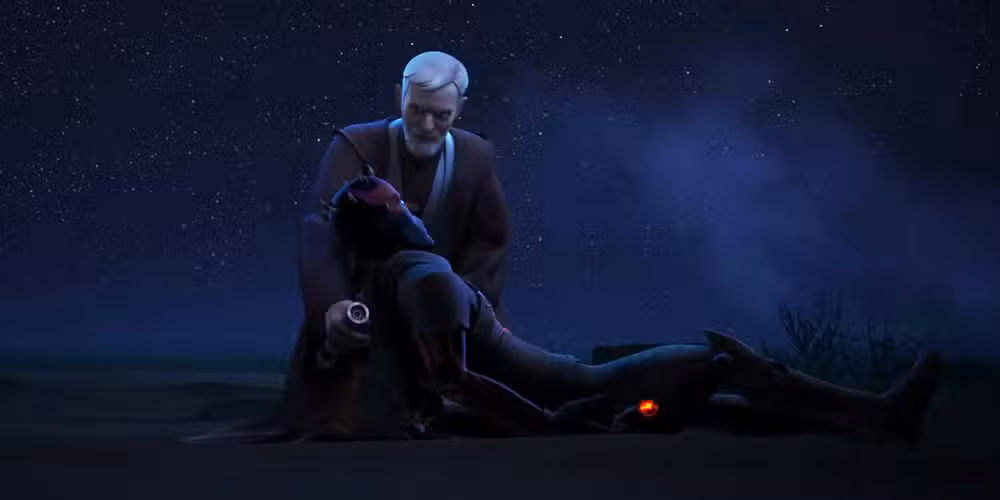 Por un lado, el episodio de Rebeldes de Star Wars en el que muere Maul, titulado Soles gemeloses una de las mejores piezas de guerra de las galaxias animación alguna vez. Es un episodio lento, deliberado y extremadamente emotivo. Maul descubre dónde se esconde Obi-Wan y viaja a las profundidades del desierto en busca de venganza.
