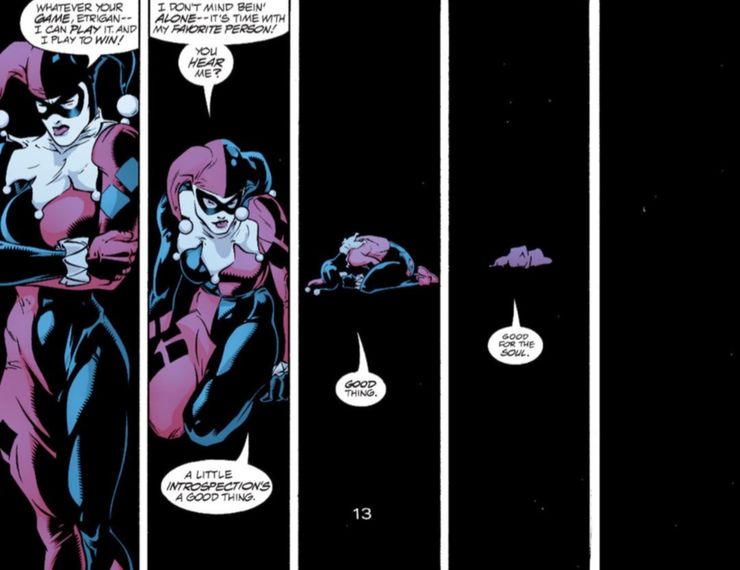 Es posible que el Big Blue Boy Scout haya recibido la mayor parte de la atención por su muerte, pero la experiencia de Harley Quinn con la perforación de su boleto fue mucho más inquietante. En harley quinn #20 por Karl Kessel y Brandon Badeaux, Harley se encuentra cayendo en espiral por un vacío negro infinito después de que una aventura con Superman en Metrópolis dejó a Harley atomizada después de empujar un jet-pack más allá de sus límites. No pasa mucho tiempo antes de que el vacío se convierta en su antiguo escondite, lleno de su propia tripulación. Desafortunadamente, la pandilla está rodeada de policías y, a medida que la ira comienza a acumularse por la situación, Harley observa a sus secuaces dispararse unos a otros hasta que ella es la única que queda en pie. Etrigan the Demon le informa a Harley que está en el infierno. Aprende que su castigo es ver morir a su tripulación en un bucle en el que se ve obligada a verlo sola en un limbo infinito.