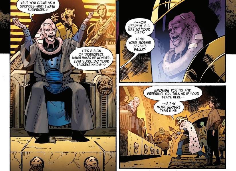 Durante su interacción, Bib Fortuna menciona que jugó un papel importante en el ascenso al poder de Zeva Bliss dentro de los corredores de Spice de Kijimi y la caída de su madre, Zarah Bliss. Fue bajo el liderazgo de Zeva que los corredores de Spice se organizaron adecuadamente en una sola fuerza. Después de Zeva, los corredores de especias de Kijimi finalmente caen bajo el liderazgo de su hija Zorii Bliss, a más tardar en el 35 DBY (después de la batalla de Yavin). Este pequeño intercambio demuestra cuán arraigados están Zorii Bliss y su familia en la historia, incluso teniendo conexiones con Bib Fortuna. También muestra que Si bien Bib Fortuna ha reemplazado a Jabba the Hutt, no está haciendo las alianzas que necesita. para mantener su nuevo puesto.