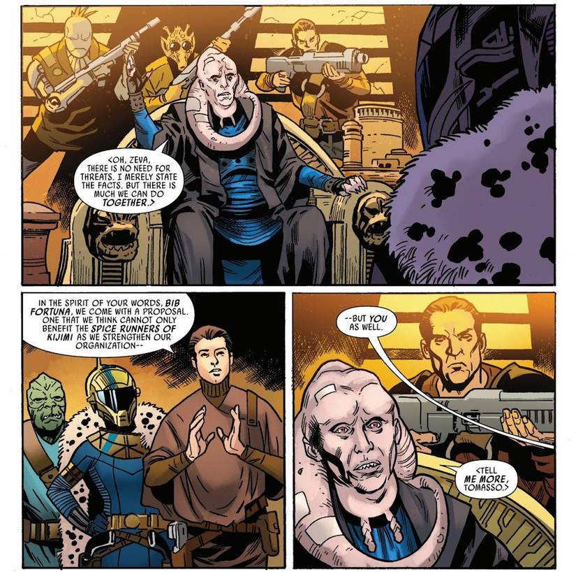 No mucho después de llenar el vacío de poder en Tatooine, llegan los primeros visitantes de Bib Fortuna, los Spice Runners de Kijimi. El líder de los corredores de las especias, Zeva Bliss, propone una alianza entre los corredores de las especias, Fortuna, y el imperial rebelde Adelhard. Fortuna se ríe y se pregunta por qué querrían alinearse con el Imperio ahora que está en ruinas. A su salida, Zeva admite ante su grupo que la verdadera razón por la que quiere ayudar a Adelhard es causar caos, ya que considera que la inestabilidad en toda la galaxia es buena para los negocios.
