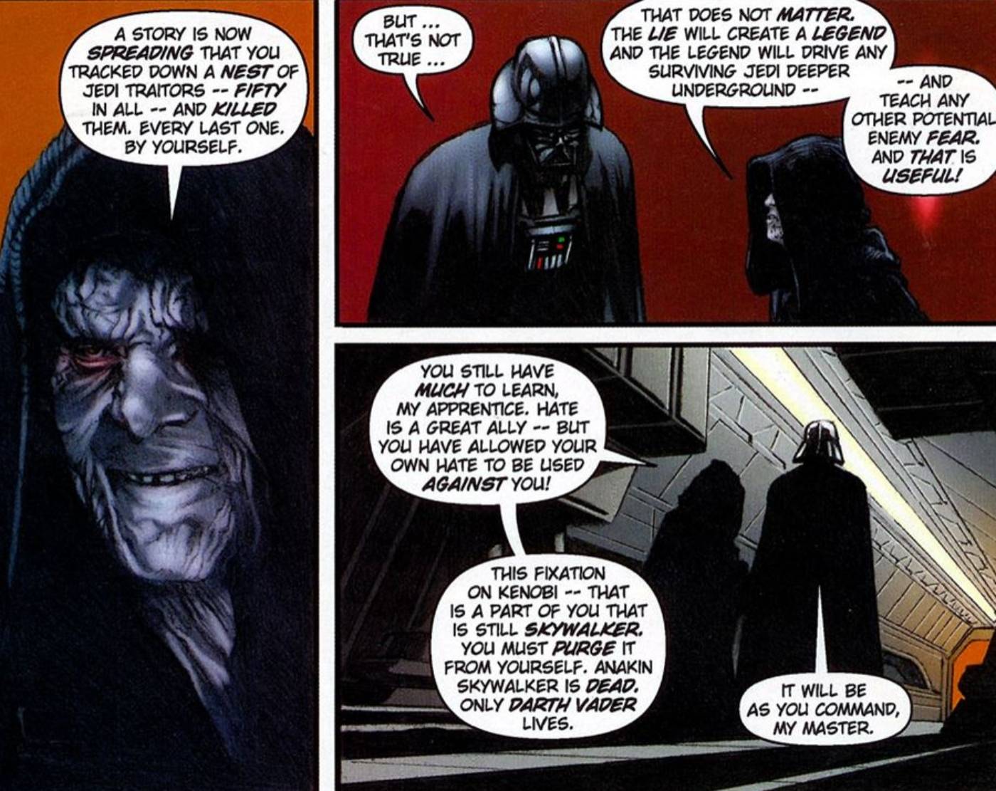 Darth Vader mató a ocho Jedi, algunos de ellos Maestros, todos con un sable de luz que fue desactivado por una hoja de cortosis a mitad de camino, y después de sufrir algunos daños importantes durante la propia batalla. Sin embargo, a pesar de esta victoria aparentemente imposible, Palpatine encontró una manera de hacerla hueca y vergonzosa exagerando los detalles hasta convertirlos en algo que Darth Vader nunca podría lograr. Palpatine plantó en la cabeza de Vader la idea de que la gente sólo le teme porque mató a 50 Jedi, haciendo que Vader se sienta perpetuamente inferior, especialmente cuando se trata de estar a la altura de las expectativas de Palpatine (y, de hecho, de la galaxia) sobre él.