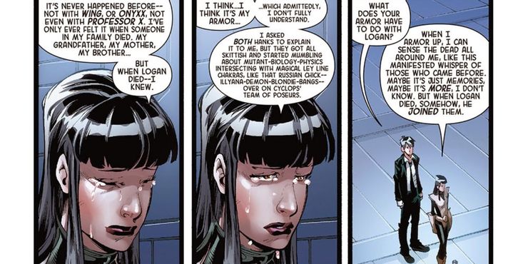El poder de Armor no solo aumentó a partir de la muerte de Logan, sino que a partir de ese momento se convirtió en parte de ella cuando su fuerza vital le dio a Armor la mejora. Como se le explicó vagamente a ella y a los fanáticos, los poderes de Armor son parcialmente espirituales, por lo que pueden acceder a otros reinos y permitirle sentir la muerte de los más cercanos a ella al mismo tiempo que le da acceso a una parte de su fuerza vital que ella a su vez usa como una mejora de potencia. La muerte de Wolverine por sí sola no mejoró la armadura, pero la fuerza vital que dejó atrás aumentó su poder, lo que significa que una parte de su aprendiz caído siempre estará con ella.