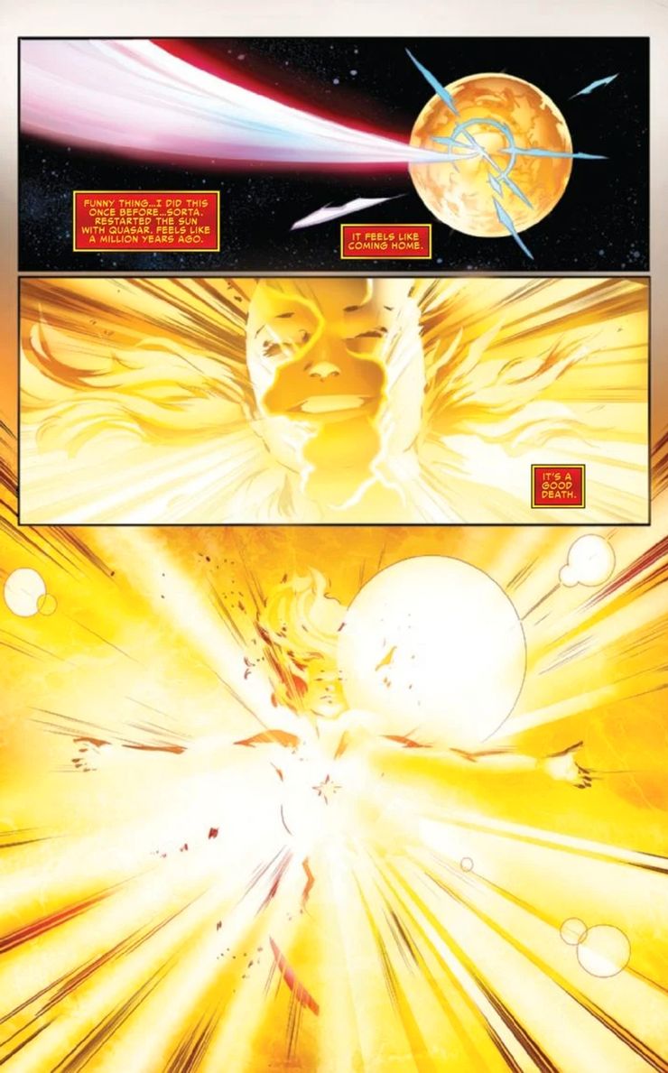 En una línea similar es Capitana Marvel: El Fin, escrito por Kelly Thompson y con arte de Carmen Carnero. El one-shot tiene lugar en 2051 durante una Tierra post-apocalíptica, con solo una gran cantidad de héroes familiares sobreviviendo junto con otros nuevos. Aquí, el Capitán Marvel regresa para descubrir que el sol se está muriendo, poniendo en peligro lo que queda del planeta. Sin dudarlo, Carol salta al espacio, vuelve a encender el sol y salva el planeta a costa de su vida. Como los personajes teóricamente más dominados de sus respectivas compañías, los dos siempre han provocado comparaciones entre el público. El Capitán Marvel y Superman incluso comparten una debilidad por la magia. En algunos casos, esas comparaciones se hacen deliberadamente en sus respectivos cómics. Sin embargo, al comparar Capitana Marvel: El Fin con Superman All-Staresas comparaciones son obvias.