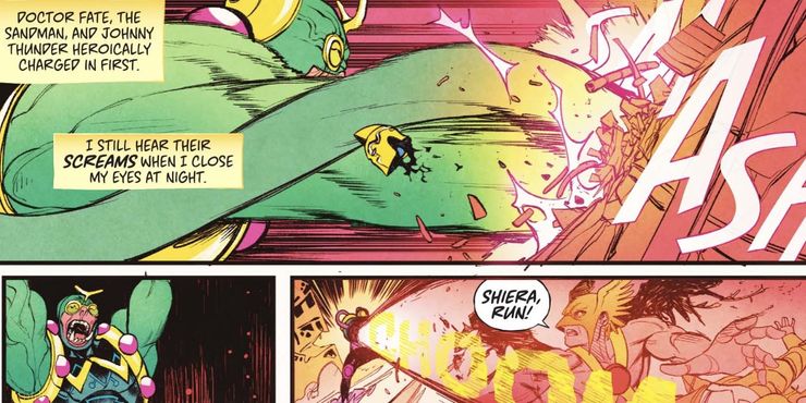 El héroe más poderoso de DC no es el único miembro de JSA que cae en la pelea, ya que el Parademon de tamaño gigante elimina a Johnny Thunder, Hawkman y Sandman antes de que lo eliminen. La batalla y la muerte del Doctor Fate y sus compañeros de equipo marcarían el final de la era de los héroes y cambiarían el Universo DC para siempre, ya que los futuros héroes operarían en mechs conociendo las amenazas potenciales del Cosmos.