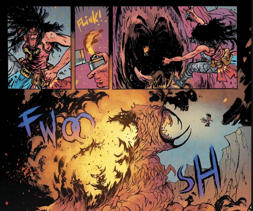 Esta escena es nada menos que épica, particularmente porque Diana ha estado en un estado debilitado desde que despertó de su sueño de siglos. Su capacidad para derrotar al gigantesco monstruo sin ningún superpoder hace que el momento sea inmensamente impresionante. Mientras contemplaba el impresionante arte de Johnson, no pude evitar sonreír, golpeado por un solo pensamiento: “Eso fue genial.” El peso emocional añadido de Diana usando el encendedor de su mejor amiga fallecida para derrotar a la bestia introduce una sorprendente capa de profundidad, consolidando esta escena como uno de mis mejores momentos de la Mujer Maravilla.