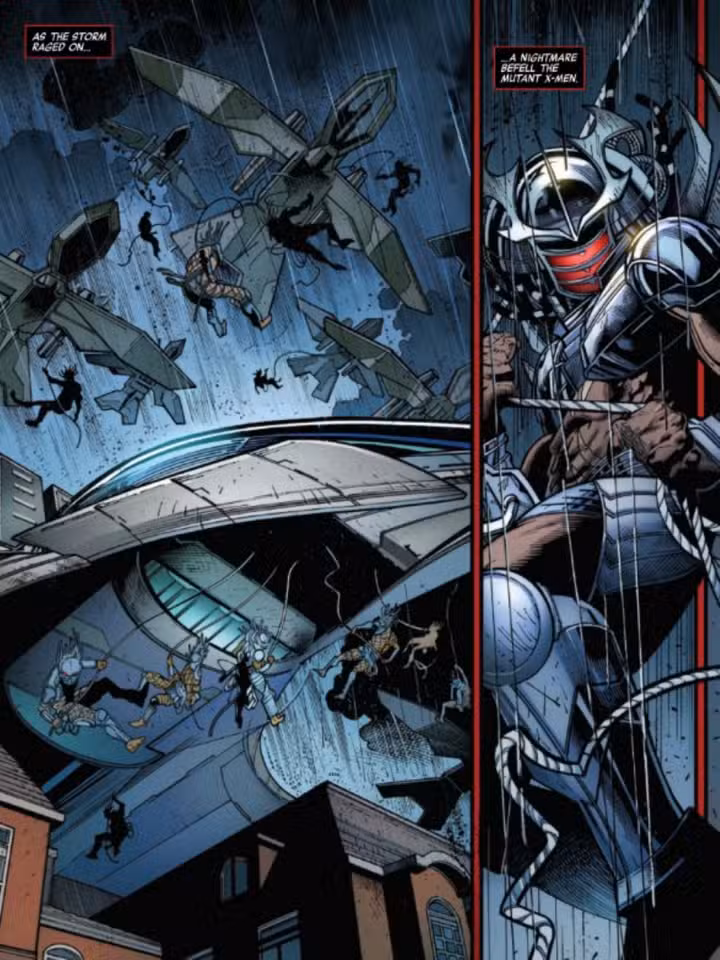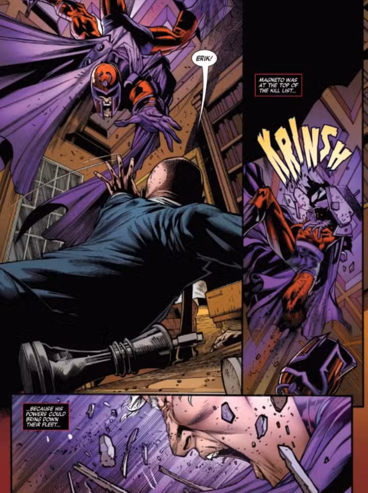 El cómic representa a Magneto soportando una muerte increíblemente brutal e insoportable de adentro hacia afuera. La narración explica por qué fue atacado: “Magneto estaba en la parte superior de la lista de asesinatos porque sus poderes podían derribar su flota y convertir su mayor arma, el Vibranium de Godmetal, en una debilidad”.