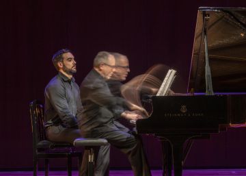 Alexander Lonquich se vale de un listón de madera en la mano derecha para poder interpretar los ‘clusters’ de ‘Hawthorne’. Dolores Iglesias / Fundación Juan March