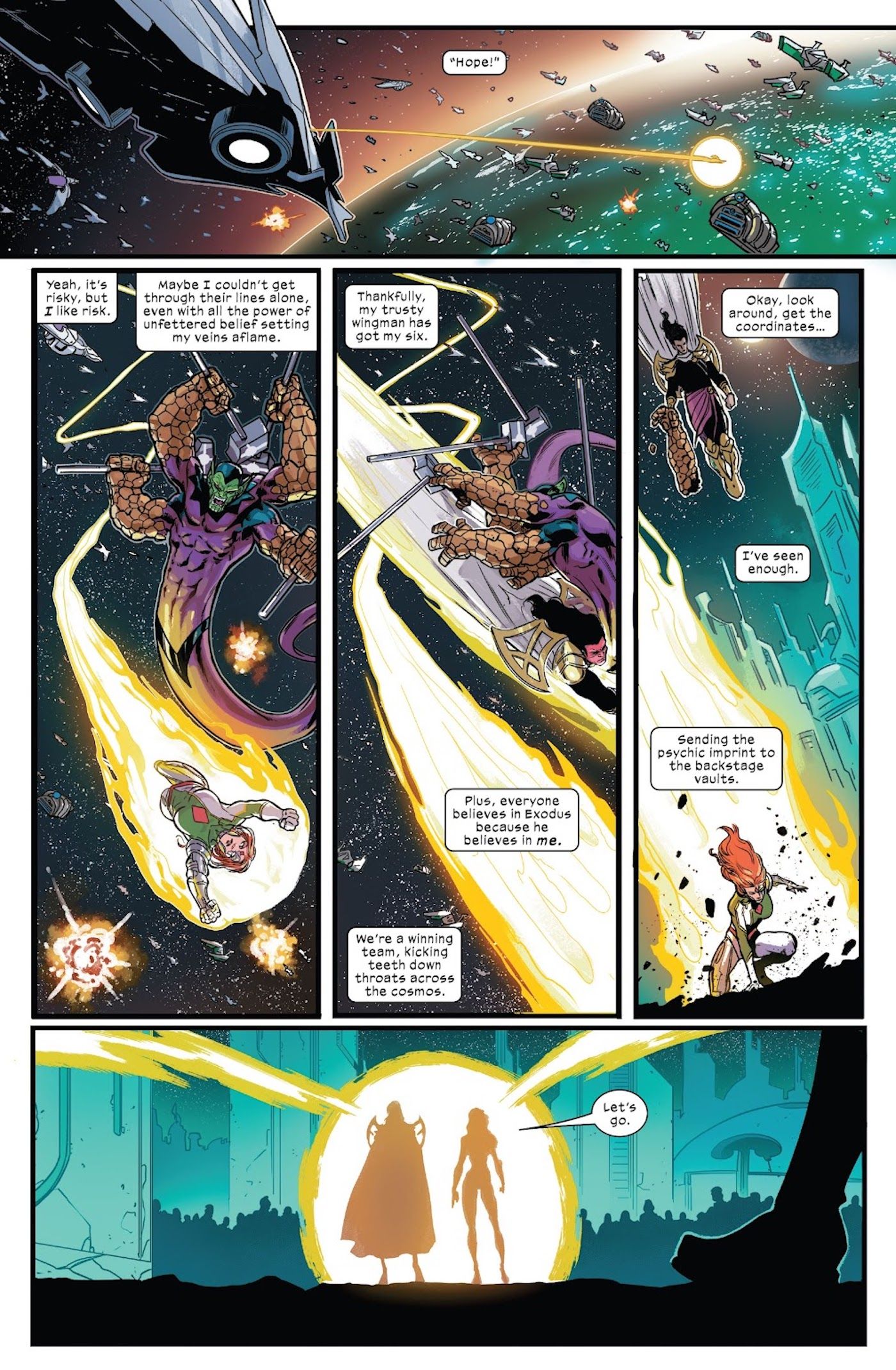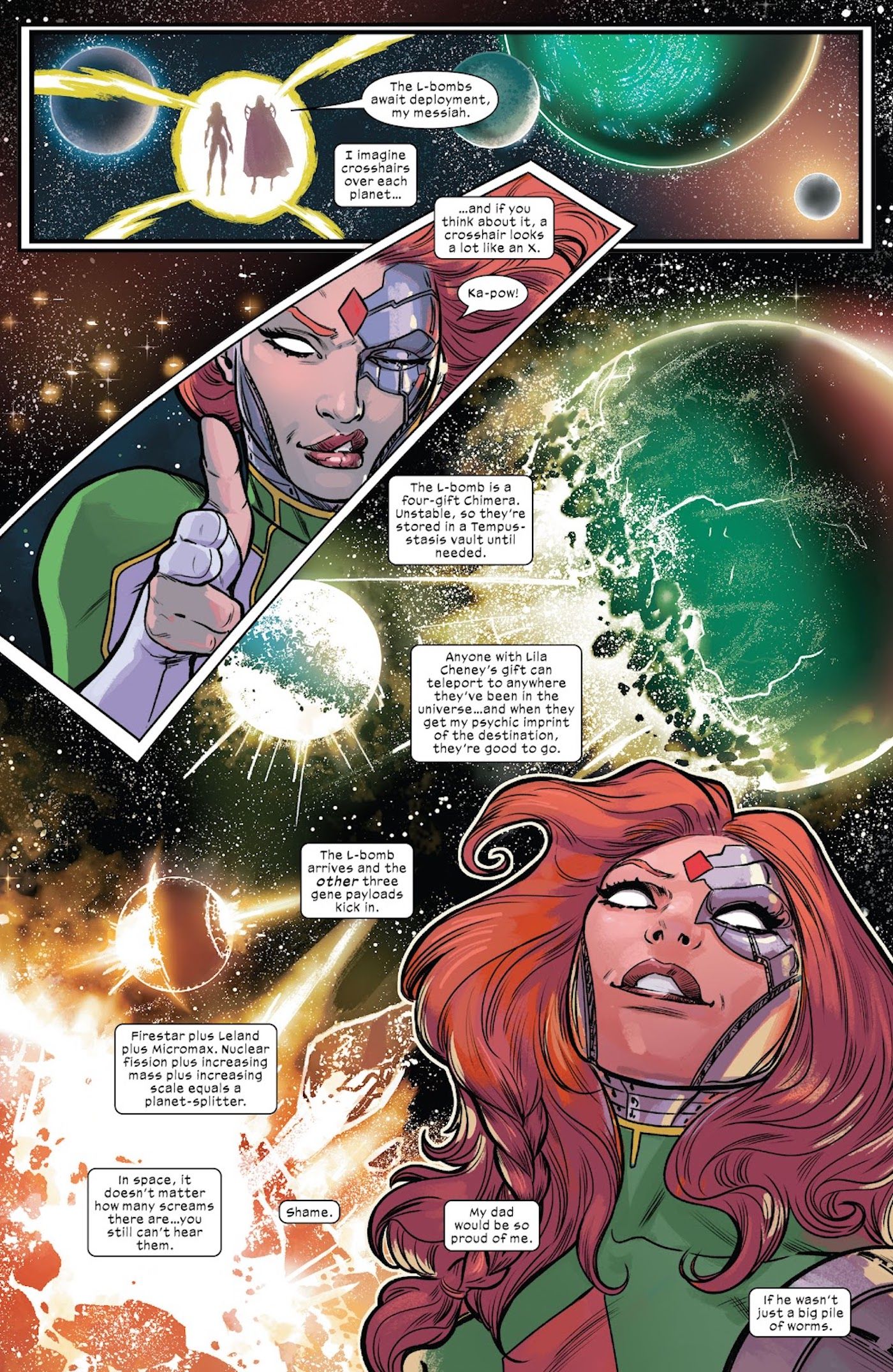 La escena inicial de X-Men inmoral #2, del escritor Kieron Gillen y la artista Andrea Di Vito, representa un horrible salto de 100 años hacia el futuro siniestro. Se ve al mesías mutante Hope Summers, hija adoptiva de Nate Summers, también conocido como Cable, destruyendo una galaxia de planetas con la ayuda de Exodus y una poderosa bomba quimera mutante. Aunque muere más adelante en el número, esta destrucción muestra por qué “Esperanza” se ha convertido en la palabra más temida de la galaxia en este momento. Después Kieron Gillen inicialmente compartió las imágenes en Twitter, el usuario Jean gris señaló en los comentarios de Gillen que los gestos malvados, el vuelo y la destrucción del planeta de Hope reflejan aterradoramente la transformación de Jean Grey en Dark Phoenix.
