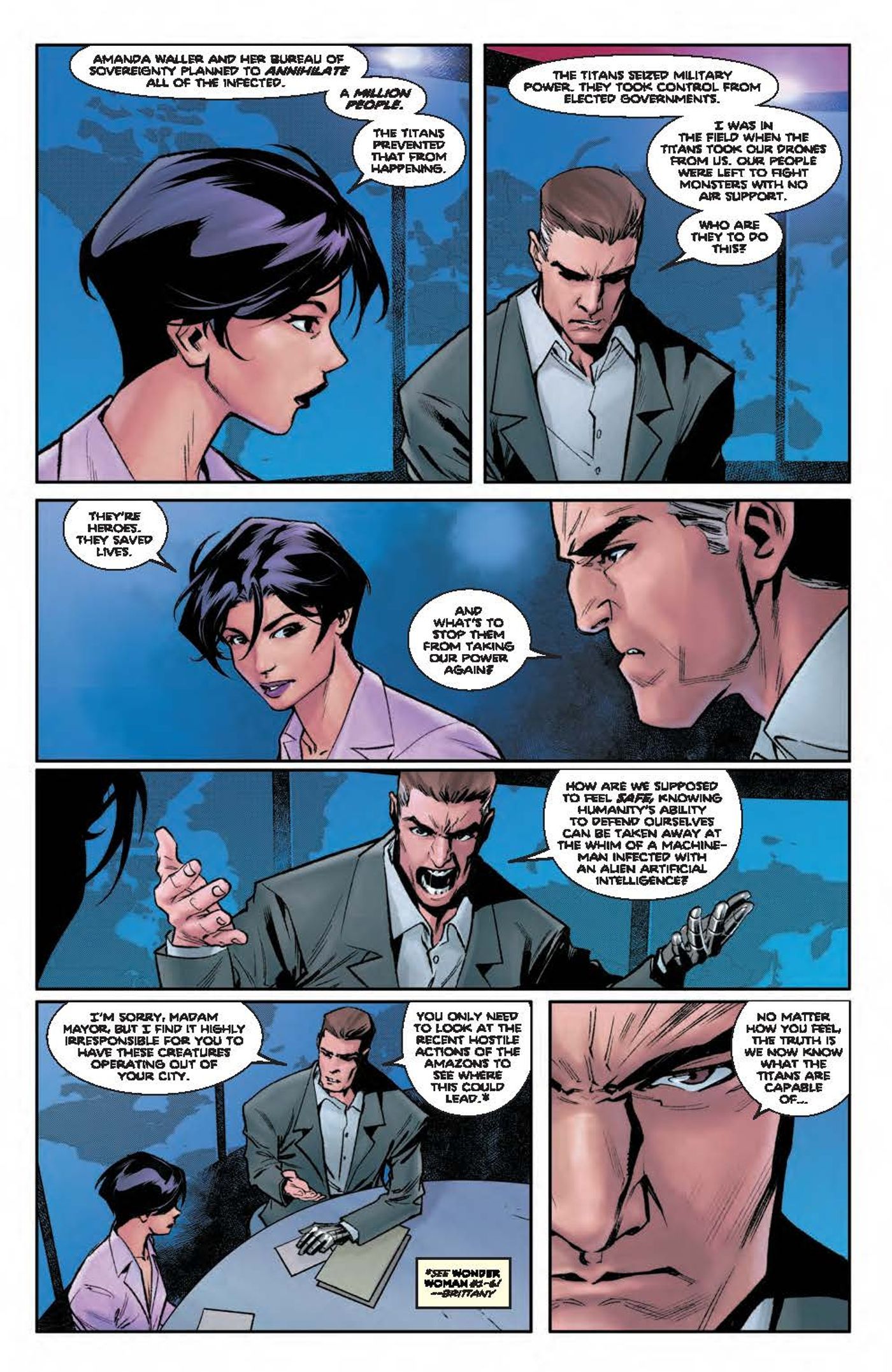 Tom Taylor: Si bien los Titanes salvaron el planeta y a su gente durante Beast World, muchos ahora los ven como una amenaza. Amanda Waller ha avivado el miedo y la división en la población mediante mentiras y tergiversaciones. Sin embargo, incluso con muchas voces fuertes tratando de derribarlos, incluso con manifestantes en su puerta,
