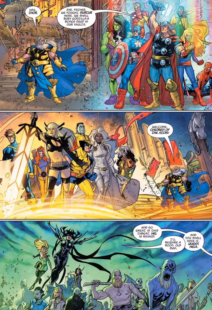 en la actualidad Godzilla: Rugido Infinito #2 – de Gerry Duggan, Ig Guara, Javier Garrón, Jesus Aburtov y Travis Lanham – Odin reúne un equipo histórico para derrotar al Rey de los Monstruos. Mientras Godzilla lucha y mata a Galactus, Odín se acerca y convoca a tres grupos a su lado: los Vengadores, los X-Men y la legión de muertos vivientes de Hela.