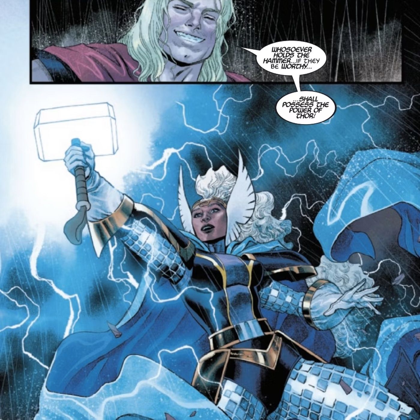 - Storm ha demostrado su valía para sostener a Mjolnir y ha asumido el papel de Thor, con un nuevo diseño de vestuario inspirado en Thor.