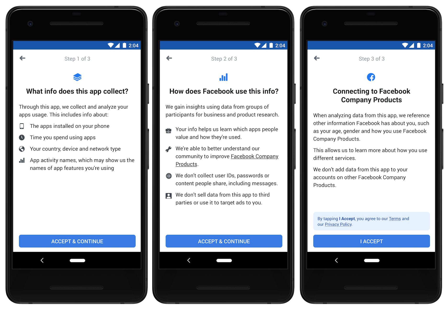 Hoy Facebook lanza su aplicación "Study From Facebook" solo para Android. Algunos adultos mayores de 18 años en los EE. UU. E India serán reclutados por anuncios dentro y fuera de Facebook para suscribirse de manera voluntaria para permitir que Facebook recopile datos adicionales de ellos a cambio de un pago mensual. Se les advertirá que Facebook recopilará qué aplicaciones están en su teléfono, cuánto tiempo pasan usando esas aplicaciones, los nombres de actividad de la aplicación de las funciones que usan en otras aplicaciones, además de su país, dispositivo y tipo de red.